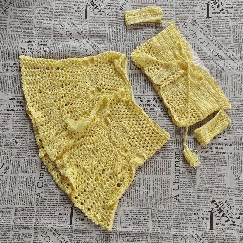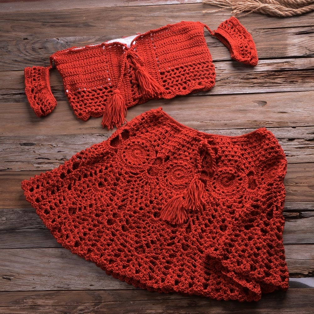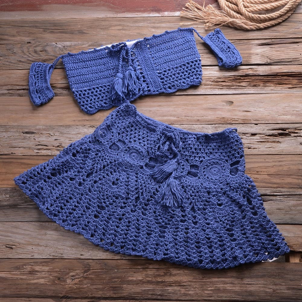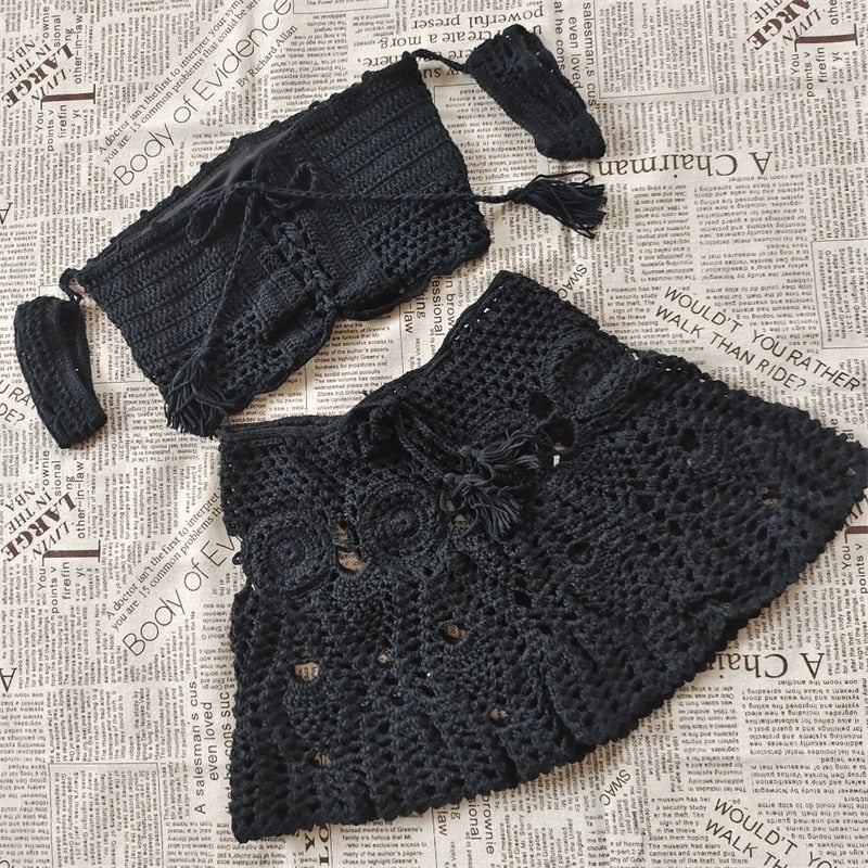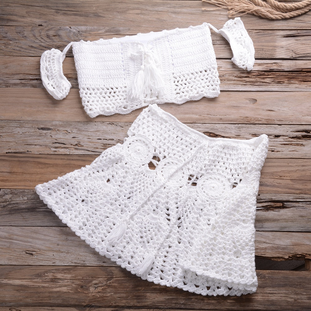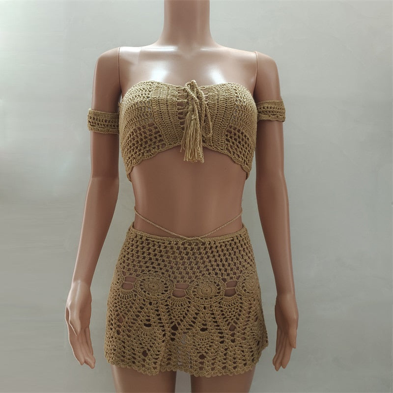 Crochet Two Piece Set Summer Beach Dress Hand Knitted Hollow Out Crop Top Mini Skirt Sheer Fishnet Cover Up Casual Suits