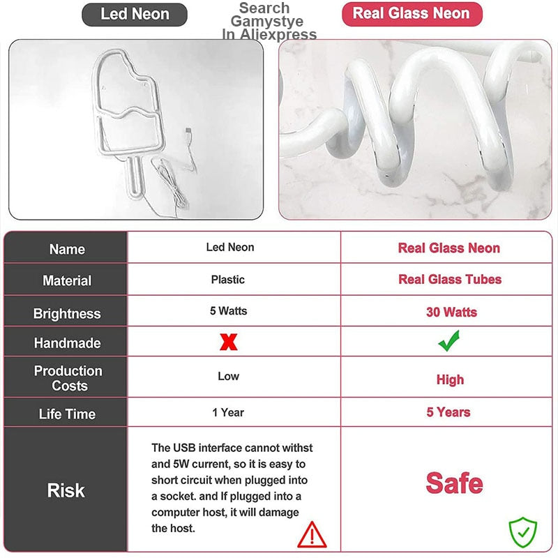 Neon signs material: Real Glass tubes, Metal frame,plastic,etc