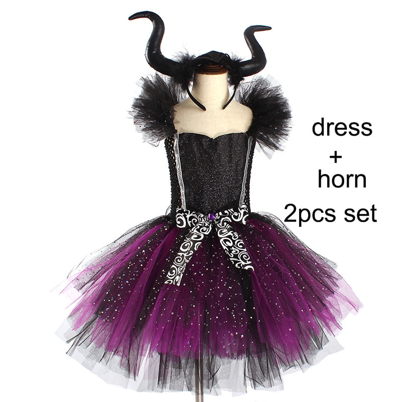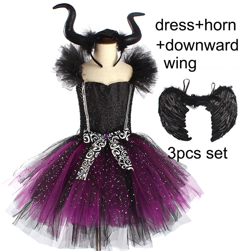 Girls Evil Dark Fairy Witch Tutu Dress with Horns and Wings Sparkly Kids Halloween Cosplay Party Costume Fancy Evil Devil Dress