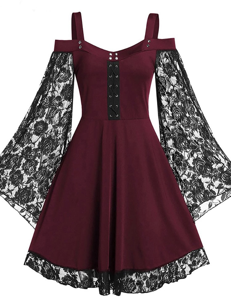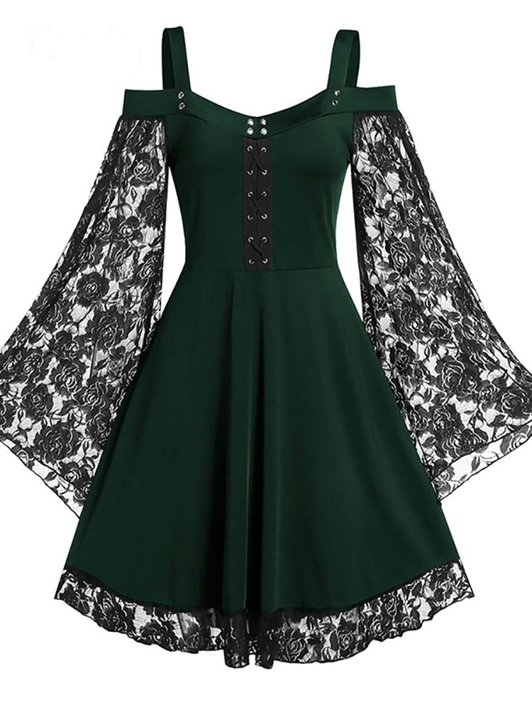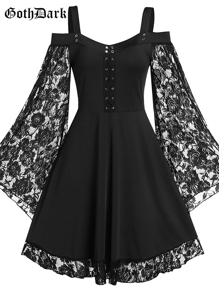 Goth Dark Gothic Aesthetic Vintage Women Autumn Dresses Grunge Lace Patchwork Flare Sleeve Black A-line Dress Punk Partywear