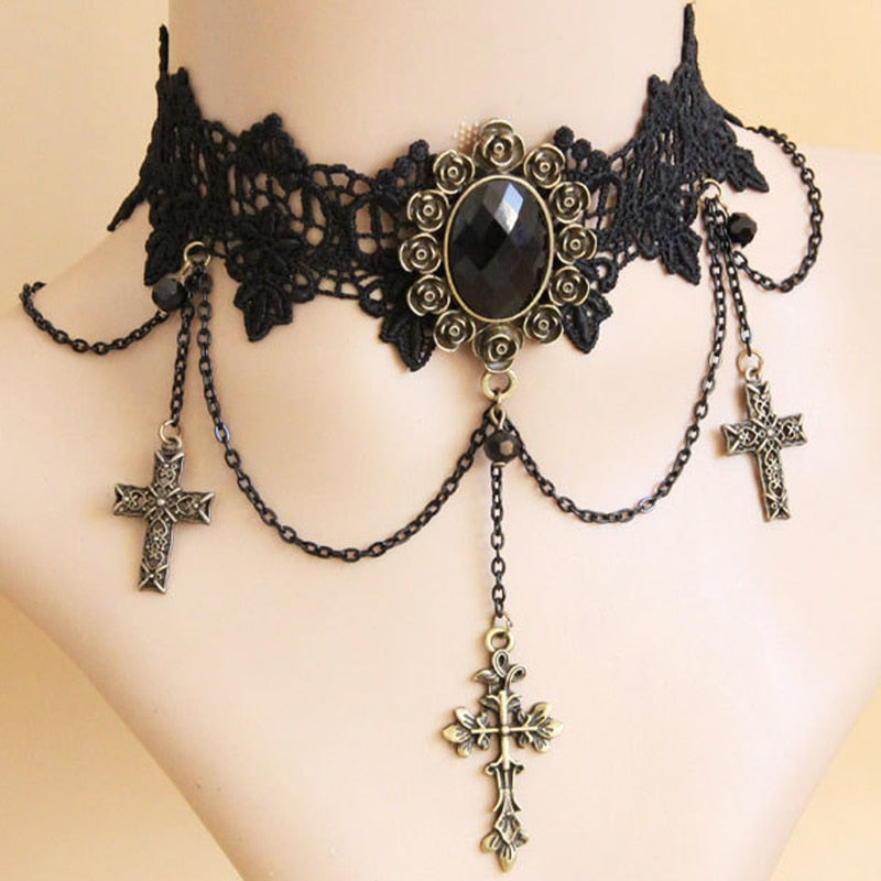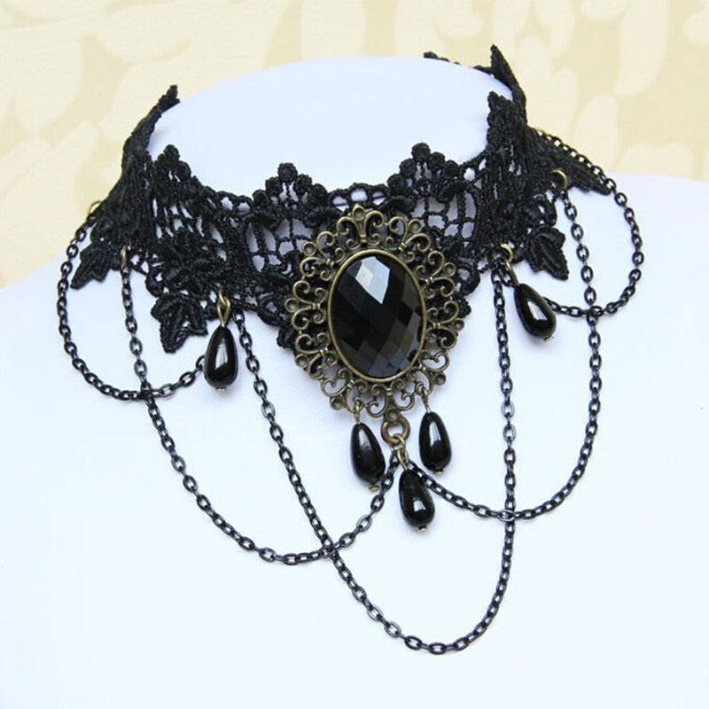 Gothic Victorian Black Lace Necklace Women Girl Boho Crystal Tassel Sexy Lace Choker Steampunk Dark Loli Style Halloween Jewelry