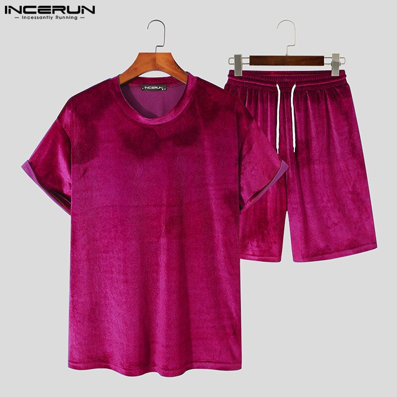INCERUN Men Casual Sets Velour Solid Color O-neck Short Sleeve T Shirt & Drawstring Shorts Two Pieces 2023 Streetwear Men Suits