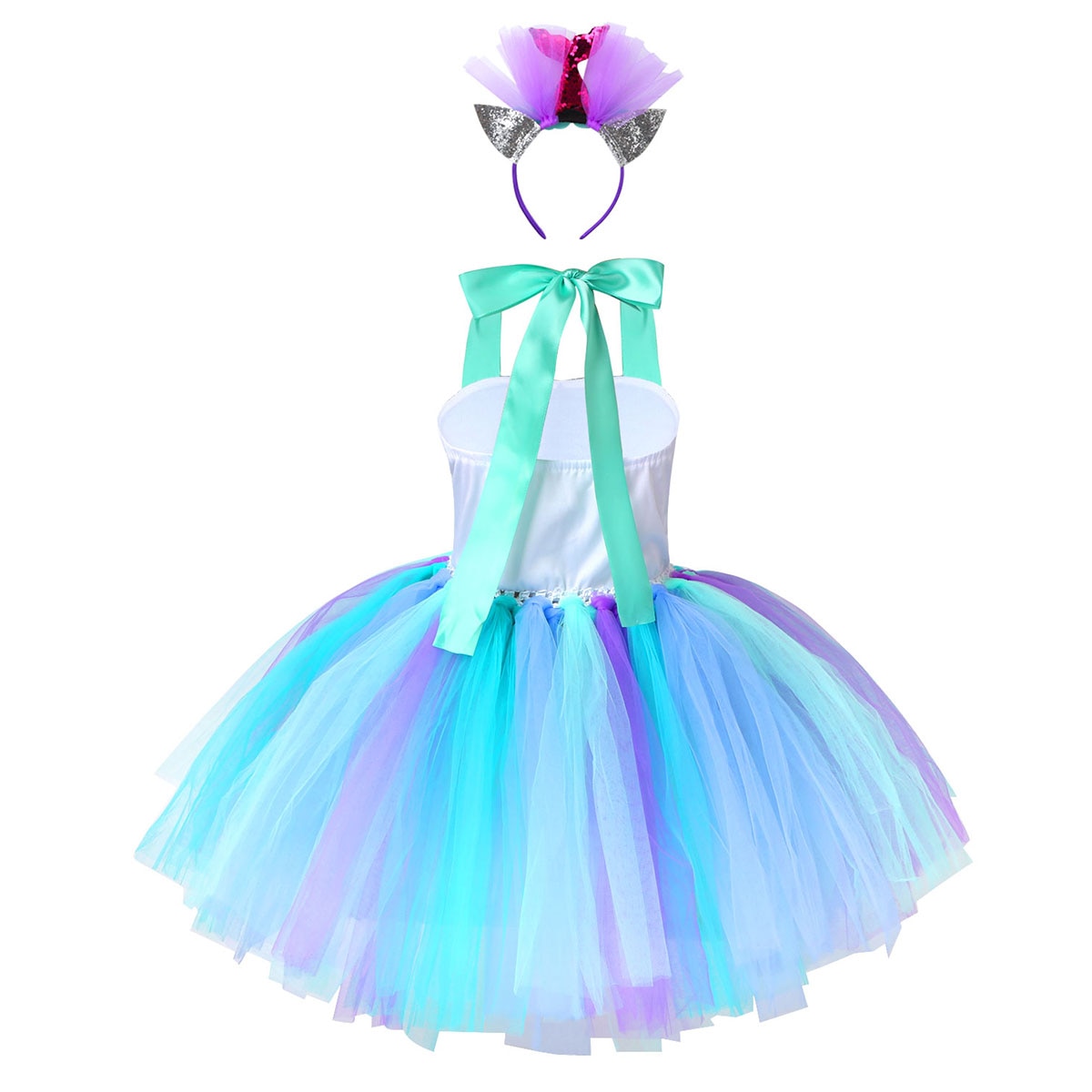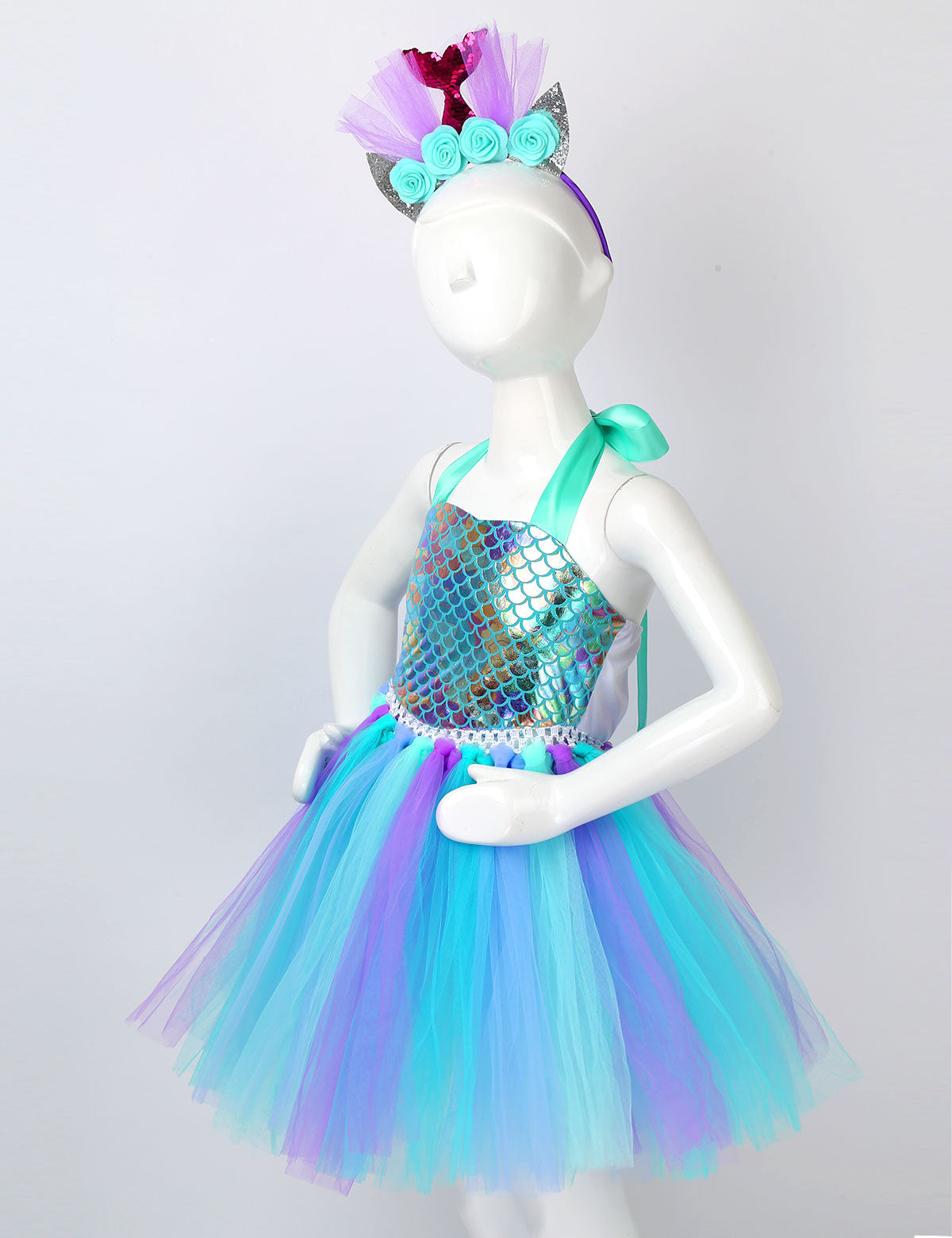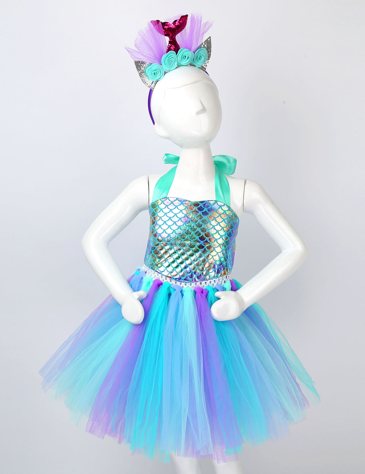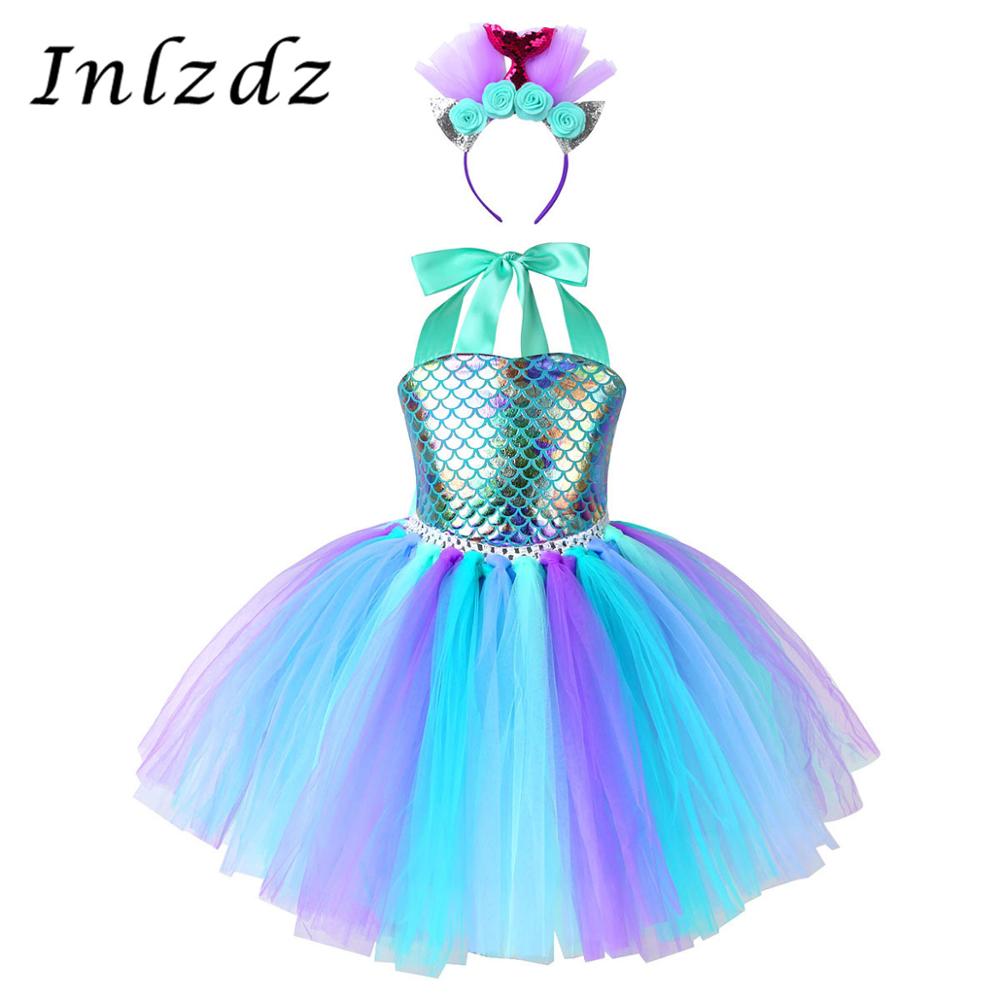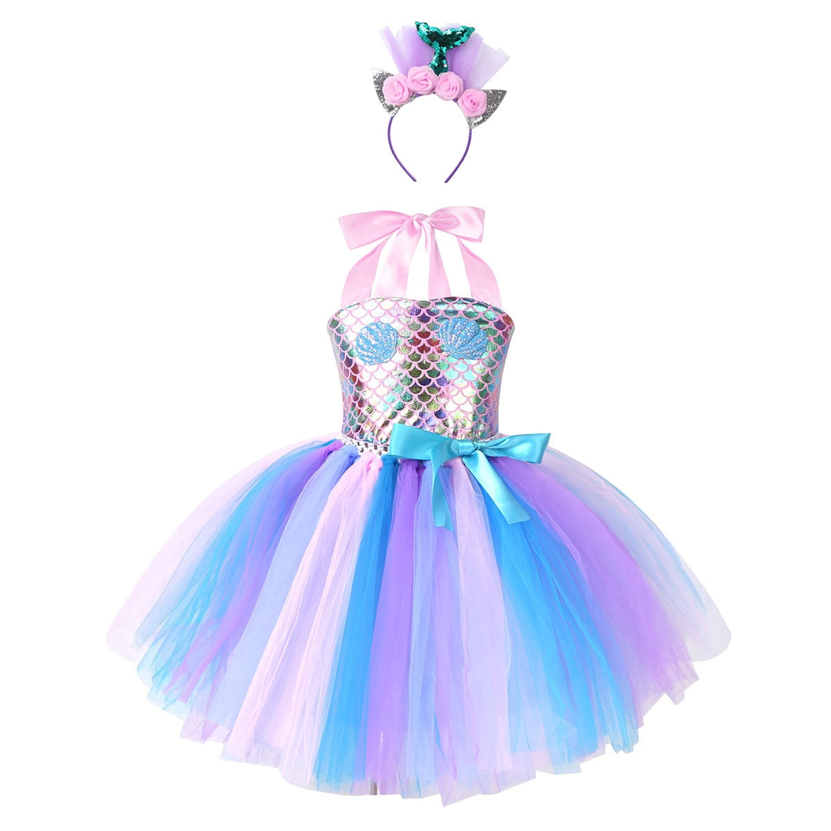 Kids Girls Mermaid Costume Outfit Halter Neck Fish Scales Printed Mesh Tutu Dress with Hair Hoop for Halloween Carnival Cosplay